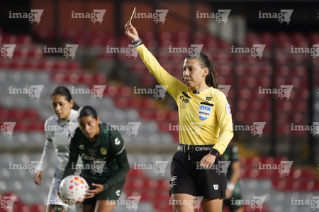 Querétaro, Querétaro, 5 de febrero de 2026. Erika Monserrat González, árbitra central muestra tarjeta amarilla de amonestación, durante el partido correspondiente a la jornada 7 del torneo Clausura 2026 de la Liga BBVA MX Femenil, entre el Club Querétaro y las Esmeraldas del León, realizado en el estadio La Corregidora Foto: Imago7/Sebastian Laureano Miranda