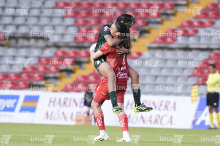 Querétaro, Querétaro, 5 de febrero de 2026. Marissa García y Lía Morán, durante el partido correspondiente a la jornada 7 del torneo Clausura 2026 de la Liga BBVA MX Femenil, entre el Club Querétaro y las Esmeraldas del León, realizado en el estadio La Corregidora Foto: Imago7/Sebastian Laureano Miranda