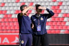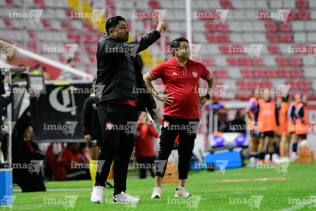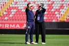 Aguascalientes, Aguascalientes, 5 de febrero de 2026. Antonio Contreras, director técnico y Nelly Simón, durante el partido correspondiente a la jornada 7 del torneo Clausura 2026 de la Liga BBVA MX Femenil, entre las Centellas del Necaxa y las Chivas Rayadas del Guadalajara, realizado en el estadio Victoria. Foto: Imago7/ Pablo Ramírez