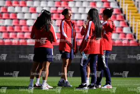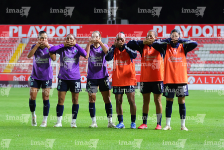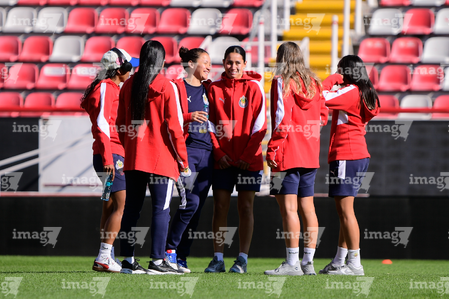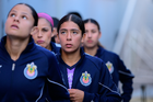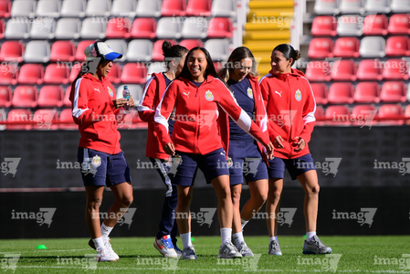 Aguascalientes, Aguascalientes, 5 de febrero de 2026. Jugadoras de Chivas femenil, durante el partido correspondiente a la jornada 7 del torneo Clausura 2026 de la Liga BBVA MX Femenil, entre las Centellas del Necaxa y las Chivas Rayadas del Guadalajara, realizado en el estadio Victoria. Foto: Imago7/ Pablo Ramírez