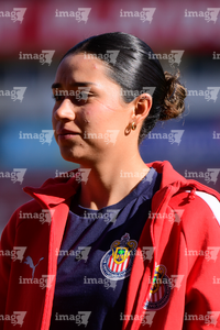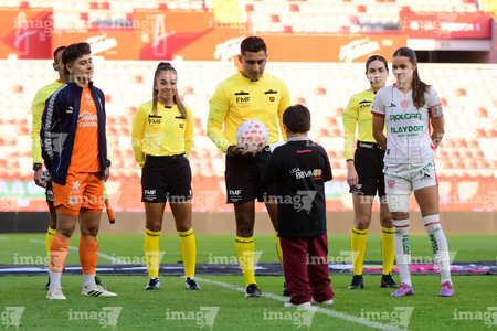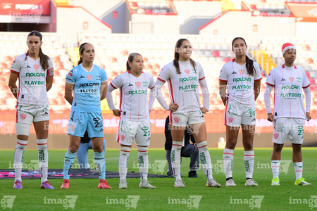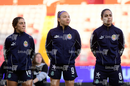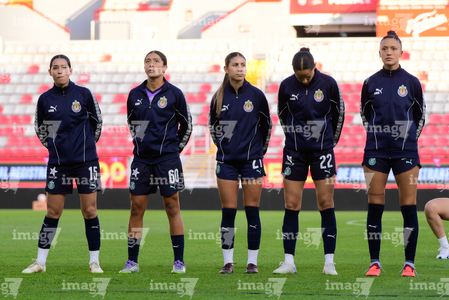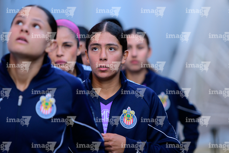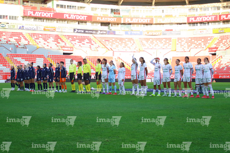 Aguascalientes, Aguascalientes, 5 de febrero de 2026. Protocolo, durante el partido correspondiente a la jornada 7 del torneo Clausura 2026 de la Liga BBVA MX Femenil, entre las Centellas del Necaxa y las Chivas Rayadas del Guadalajara, realizado en el estadio Victoria. Foto: Imago7/ Rogelio Davila