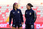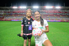 Aguascalientes, Aguascalientes, 5 de febrero de 2026. Blanca Félix y Viridiana Salazar se toman selfie, durante el partido correspondiente a la jornada 7 del torneo Clausura 2026 de la Liga BBVA MX Femenil, entre las Centellas del Necaxa y las Chivas Rayadas del Guadalajara, realizado en el estadio Victoria. Foto: Imago7/ Pablo Ramírez