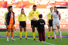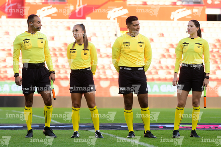 Aguascalientes, Aguascalientes, 5 de febrero de 2026. Árbitros, durante el partido correspondiente a la jornada 7 del torneo Clausura 2026 de la Liga BBVA MX Femenil, entre las Centellas del Necaxa y las Chivas Rayadas del Guadalajara, realizado en el estadio Victoria. Foto: Imago7/ Pablo Ramírez