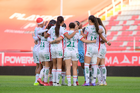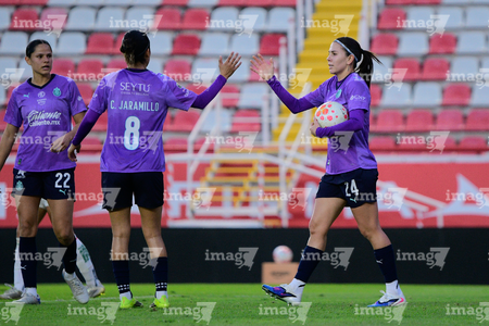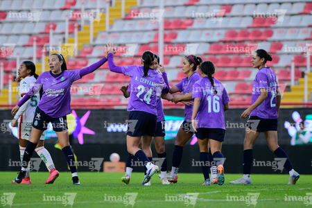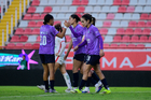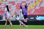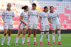 Aguascalientes, Aguascalientes, 5 de febrero de 2026. Jugadoras del Necaxa femenil, durante el partido correspondiente a la jornada 7 del torneo Clausura 2026 de la Liga BBVA MX Femenil, entre las Centellas del Necaxa y las Chivas Rayadas del Guadalajara, realizado en el estadio Victoria. Foto: Imago7/ Pablo Ramírez