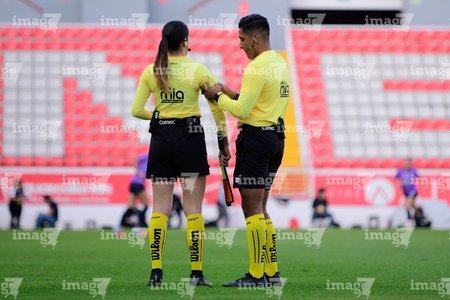 Aguascalientes, Aguascalientes, 5 de febrero de 2026. Melanie Esmeralda Villavicencio, árbitra asistente y Iván Alberto Salazar, árbitro central, durante el partido correspondiente a la jornada 7 del torneo Clausura 2026 de la Liga BBVA MX Femenil, entre las Centellas del Necaxa y las Chivas Rayadas del Guadalajara, realizado en el estadio Victoria. Foto: Imago7/ Pablo Ramírez