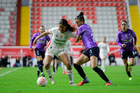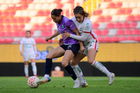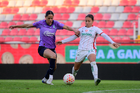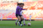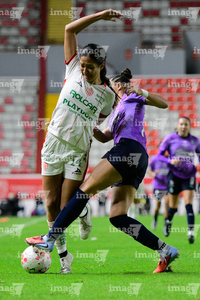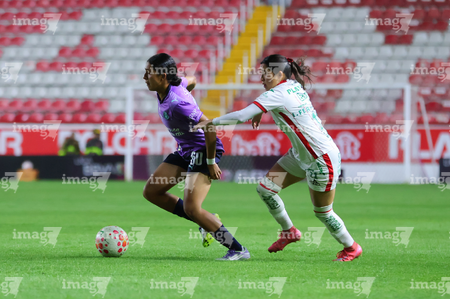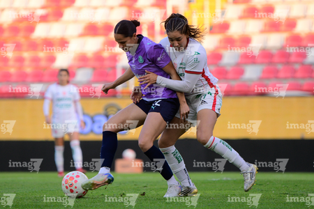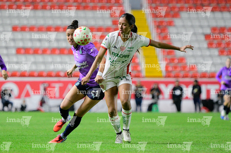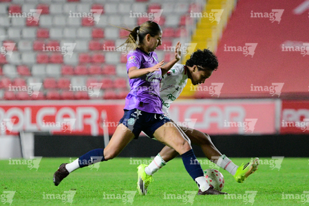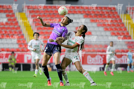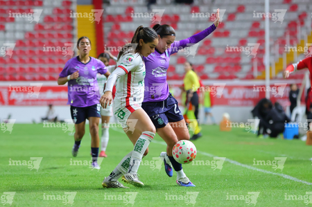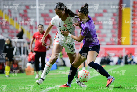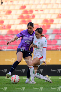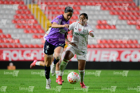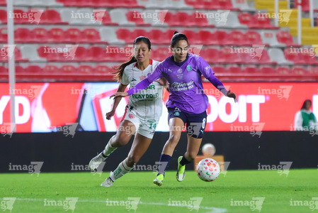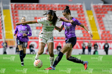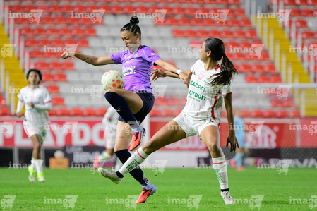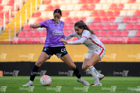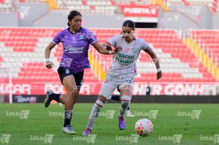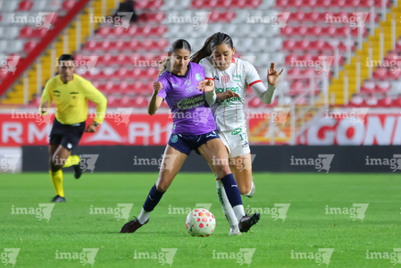 Aguascalientes, Aguascalientes, 5 de febrero de 2026. Trinidad Quiroz y Samantha López, durante el partido correspondiente a la jornada 7 del torneo Clausura 2026 de la Liga BBVA MX Femenil, entre las Centellas del Necaxa y las Chivas Rayadas del Guadalajara, realizado en el estadio Victoria. Foto: Imago7/ Pablo Ramírez