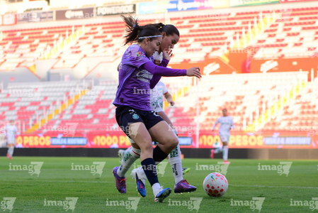 Aguascalientes, Aguascalientes, 5 de febrero de 2026. Ana Torres y Alicia Cervantes, durante el partido correspondiente a la jornada 7 del torneo Clausura 2026 de la Liga BBVA MX Femenil, entre las Centellas del Necaxa y las Chivas Rayadas del Guadalajara, realizado en el estadio Victoria. Foto: Imago7/ Rogelio Davila