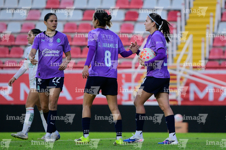 Aguascalientes, Aguascalientes, 5 de febrero de 2026. Eva González, Gabriela Valenzuela y Carolina Jaramillo, durante el partido correspondiente a la jornada 7 del torneo Clausura 2026 de la Liga BBVA MX Femenil, entre las Centellas del Necaxa y las Chivas Rayadas del Guadalajara, realizado en el estadio Victoria. Foto: Imago7/ Pablo Ramírez