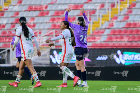 Aguascalientes, Aguascalientes, 5 de febrero de 2026. Amalia López y Ana Torres, durante el partido correspondiente a la jornada 7 del torneo Clausura 2026 de la Liga BBVA MX Femenil, entre las Centellas del Necaxa y las Chivas Rayadas del Guadalajara, realizado en el estadio Victoria. Foto: Imago7/ Rogelio Davila