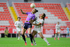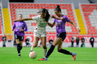 Aguascalientes, Aguascalientes, 5 de febrero de 2026. Cynthia González y Fátima Bracamonte, durante el partido correspondiente a la jornada 7 del torneo Clausura 2026 de la Liga BBVA MX Femenil, entre las Centellas del Necaxa y las Chivas Rayadas del Guadalajara, realizado en el estadio Victoria. Foto: Imago7/ Pablo Ramírez
