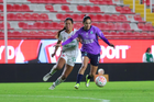 Aguascalientes, Aguascalientes, 5 de febrero de 2026. Carolina Jaramillo y Jada Barnett, durante el partido correspondiente a la jornada 7 del torneo Clausura 2026 de la Liga BBVA MX Femenil, entre las Centellas del Necaxa y las Chivas Rayadas del Guadalajara, realizado en el estadio Victoria. Foto: Imago7/ Pablo Ramírez