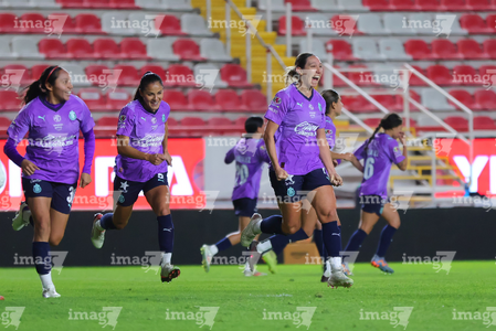 Aguascalientes, Aguascalientes, 5 de febrero de 2026. Jugadoras de Chivas femenil en festejo de gol, durante el partido correspondiente a la jornada 7 del torneo Clausura 2026 de la Liga BBVA MX Femenil, entre las Centellas del Necaxa y las Chivas Rayadas del Guadalajara, realizado en el estadio Victoria. Foto: Imago7/ Pablo Ramírez