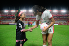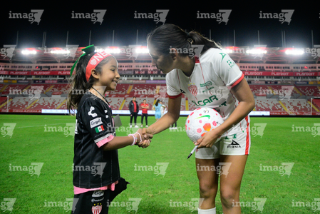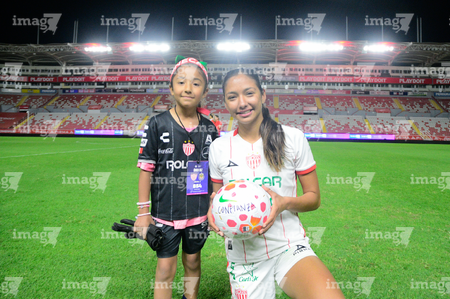 Aguascalientes, Aguascalientes, 5 de febrero de 2026. Trinidad Quiroz regala balón con valor a Aficionada, durante el partido correspondiente a la jornada 7 del torneo Clausura 2026 de la Liga BBVA MX Femenil, entre las Centellas del Necaxa y las Chivas Rayadas del Guadalajara, realizado en el estadio Victoria. Foto: Imago7/ Pablo Ramírez