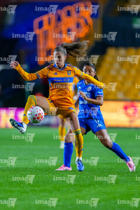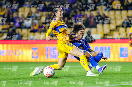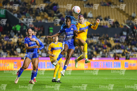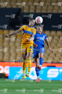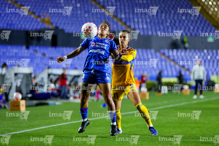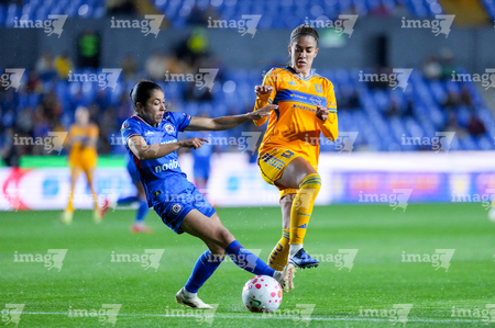 San Nicolás de los Garza, Nuevo León, 5 de febrero de 2026. Lizbeth Ángeles y Jheniffer Cordinali, durante el partido correspondiente a la jornada 7 del torneo Clausura 2026 de la Liga BBVA MX Femenil, entre las Tigres de la UANL y la Máquina Celeste del Cruz Azul, realizado en el estadio Universitario. Foto: Imago7/ Nora Pamela
