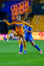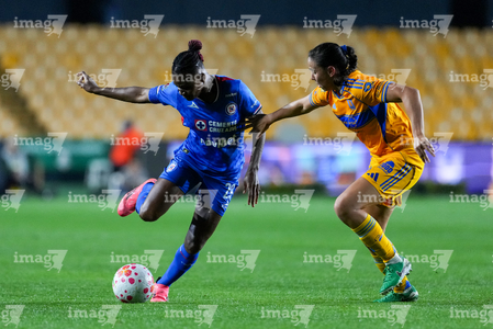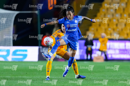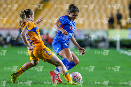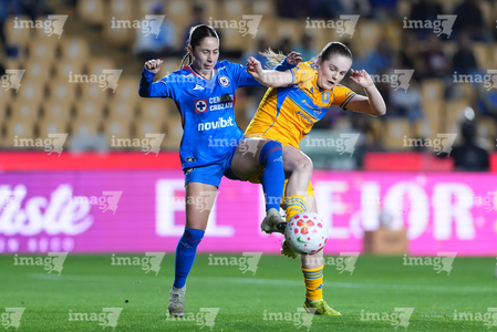 San Nicolás de los Garza, Nuevo León, 5 de febrero de 2026. Ana Lucía Martínez y Jheniffer Cordinali, durante el partido correspondiente a la jornada 7 del torneo Clausura 2026 de la Liga BBVA MX Femenil, entre las Tigres de la UANL y la Máquina Celeste del Cruz Azul, realizado en el estadio Universitario. Foto: Imago7/ Andrea Jiménez