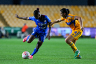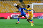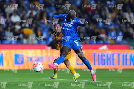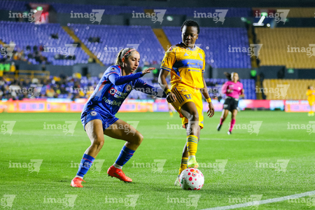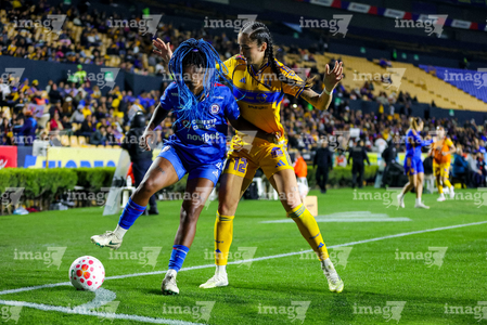 San Nicolás de los Garza, Nuevo León, 5 de febrero de 2026. Araceli Torres y Thembi Kgatlana, durante el partido correspondiente a la jornada 7 del torneo Clausura 2026 de la Liga BBVA MX Femenil, entre las Tigres de la UANL y la Máquina Celeste del Cruz Azul, realizado en el estadio Universitario. Foto: Imago7/ Nora Pamela