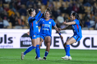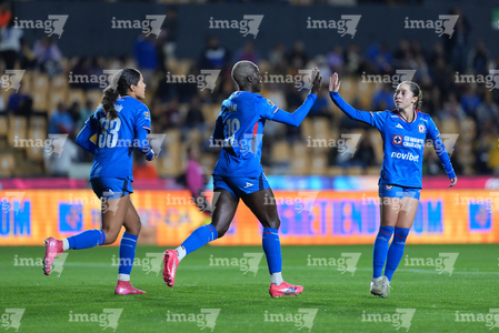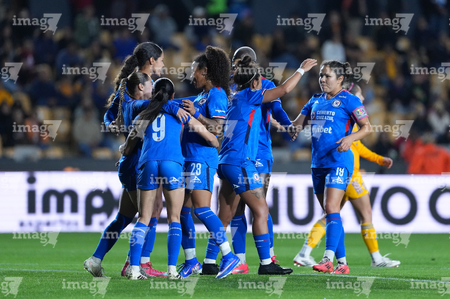 San Nicolás de los Garza, Nuevo León, 5 de febrero de 2026. Jugadoras de Cruz Azul femenil en festejo de gol, durante el partido correspondiente a la jornada 7 del torneo Clausura 2026 de la Liga BBVA MX Femenil, entre las Tigres de la UANL y la Máquina Celeste del Cruz Azul, realizado en el estadio Universitario. Foto: Imago7/ Andrea Jiménez