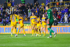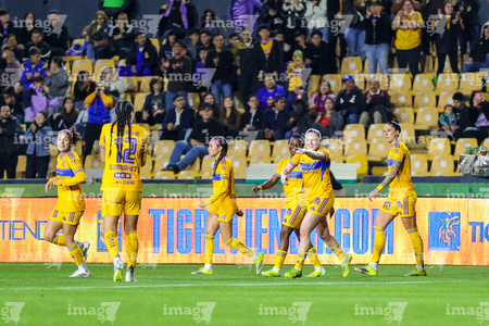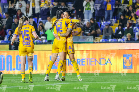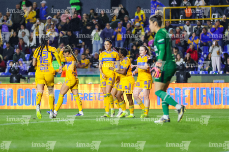 San Nicolás de los Garza, Nuevo León, 5 de febrero de 2026. Jugadoras de Tigres femenil en festejo de gol, durante el partido correspondiente a la jornada 7 del torneo Clausura 2026 de la Liga BBVA MX Femenil, entre las Tigres de la UANL y la Máquina Celeste del Cruz Azul, realizado en el estadio Universitario. Foto: Imago7/ Nora Pamela