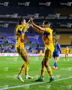 San Nicolás de los Garza, Nuevo León, 5 de febrero de 2026. Michaela Abam y Alejandra Lomelí en festejo de gol, durante el partido correspondiente a la jornada 7 del torneo Clausura 2026 de la Liga BBVA MX Femenil, entre las Tigres de la UANL y la Máquina Celeste del Cruz Azul, realizado en el estadio Universitario. Foto: Imago7/ Andrea Jiménez
