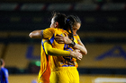 San Nicolás de los Garza, Nuevo León, 5 de febrero de 2026. Michaela Abam y Aerial Chavarin en festejo de gol, durante el partido correspondiente a la jornada 7 del torneo Clausura 2026 de la Liga BBVA MX Femenil, entre las Tigres de la UANL y la Máquina Celeste del Cruz Azul, realizado en el estadio Universitario. Foto: Imago7/ Andrea Jiménez