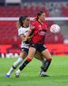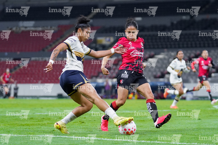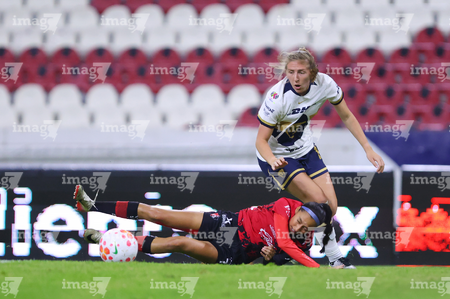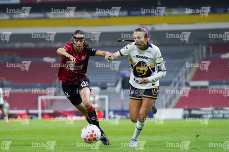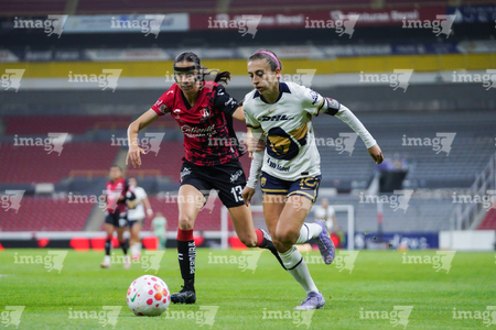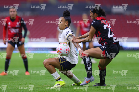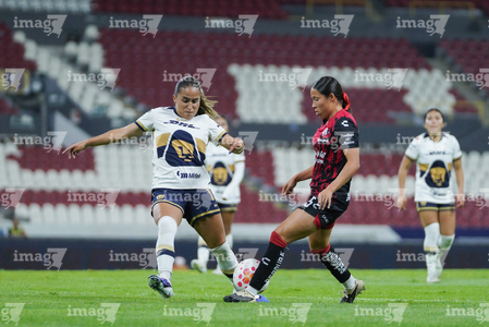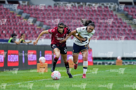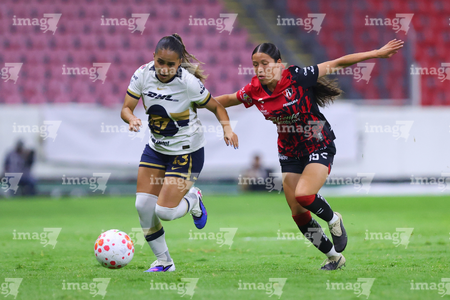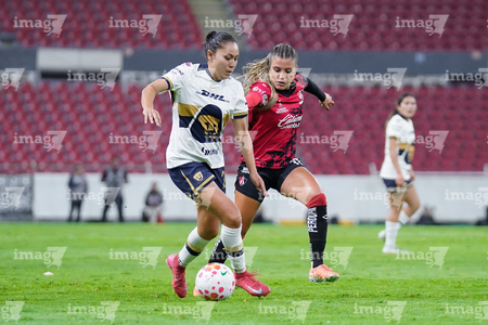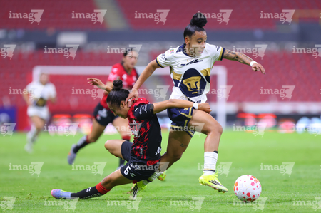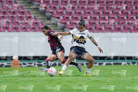Guadalajara, Jalisco, 5 de febrero de 2026. Liced Serna y Renata Huerta, durante el partido correspondiente a la jornada 7 del torneo Clausura 2026 de la Liga BBVA MX Femenil, entre las Rojinegras del Atlas y las Pumas de la UNAM, realizado en el estadio Jalisco. Foto: Imago7/ Juan Carlos Cubeyro.