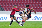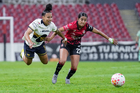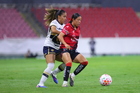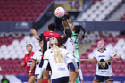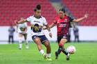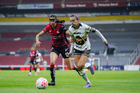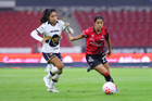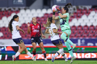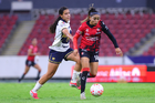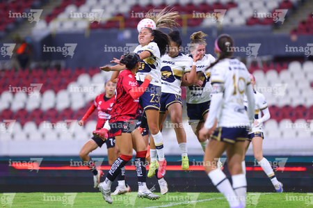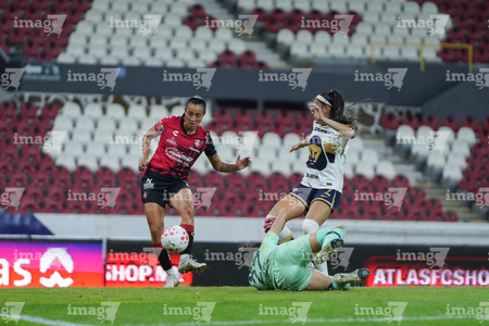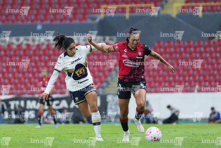 Guadalajara, Jalisco, 5 de febrero de 2026. Silvana Flores y Jaquelín García, durante el partido correspondiente a la jornada 7 del torneo Clausura 2026 de la Liga BBVA MX Femenil, entre las Rojinegras del Atlas y las Pumas de la UNAM, realizado en el estadio Jalisco. Foto: Imago7/ Hugo Ramírez