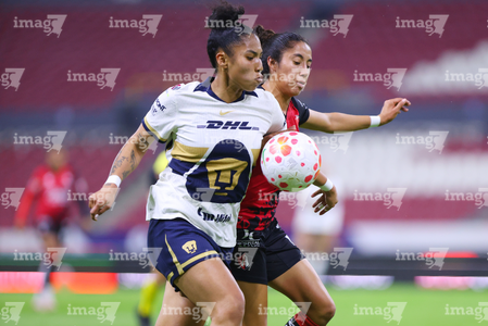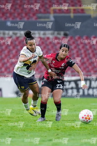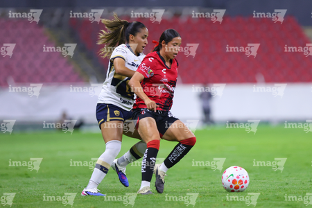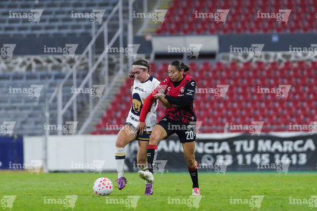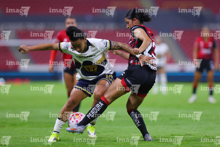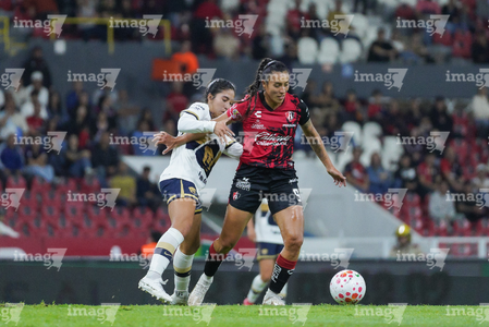 Guadalajara, Jalisco, 5 de febrero de 2026. Wendy Bonilla y Vanessa Penuna, durante el partido correspondiente a la jornada 7 del torneo Clausura 2026 de la Liga BBVA MX Femenil, entre las Rojinegras del Atlas y las Pumas de la UNAM, realizado en el estadio Jalisco. Foto: Imago7/ Juan Carlos Cubeyro.