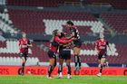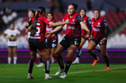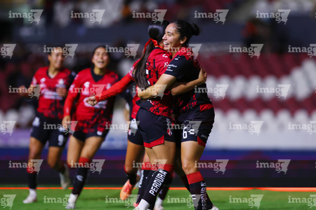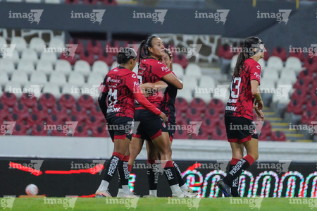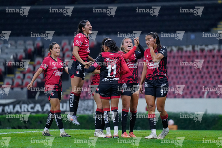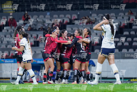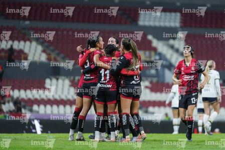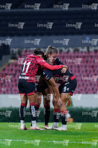 Guadalajara, Jalisco, 5 de febrero de 2026. Jugadoras del Atlas femenil en festejo de gol, durante el partido correspondiente a la jornada 7 del torneo Clausura 2026 de la Liga BBVA MX Femenil, entre las Rojinegras del Atlas y las Pumas de la UNAM, realizado en el estadio Jalisco. Foto: Imago7/ Hugo Ramírez