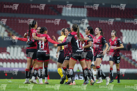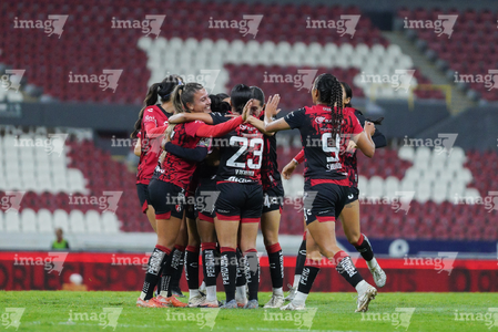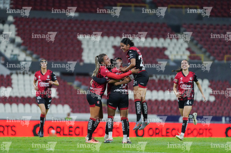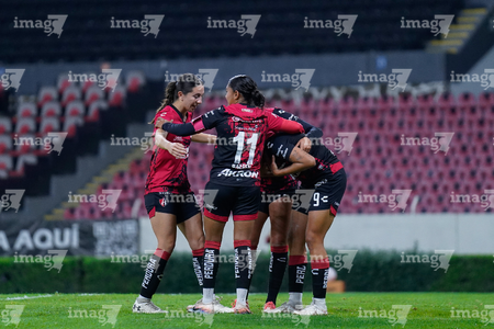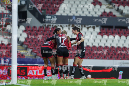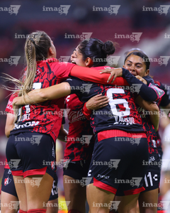 Guadalajara, Jalisco, 5 de febrero de 2026. Jugadoras del Atlas femenil en festejo de gol, durante el partido correspondiente a la jornada 7 del torneo Clausura 2026 de la Liga BBVA MX Femenil, entre las Rojinegras del Atlas y las Pumas de la UNAM, realizado en el estadio Jalisco. Foto: Imago7/ Alejandro Lias