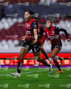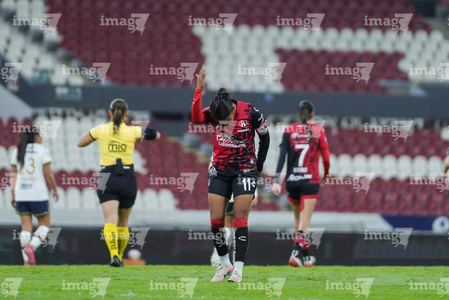Guadalajara, Jalisco, 5 de febrero de 2026. Wendy Bonilla en festejo de gol, durante el partido correspondiente a la jornada 7 del torneo Clausura 2026 de la Liga BBVA MX Femenil, entre las Rojinegras del Atlas y las Pumas de la UNAM, realizado en el estadio Jalisco. Foto: Imago7/ Juan Carlos Cubeyro.