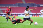Guadalajara, Jalisco, 5 de febrero de 2026. Sanjuana Muñoz y Celia Gaynor, durante el partido correspondiente a la jornada 7 del torneo Clausura 2026 de la Liga BBVA MX Femenil, entre las Rojinegras del Atlas y las Pumas de la UNAM, realizado en el estadio Jalisco. Foto: Imago7/ Hugo Ramírez