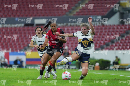 Guadalajara, Jalisco, 5 de febrero de 2026. Karen Flores y Celia Gaynor, durante el partido correspondiente a la jornada 7 del torneo Clausura 2026 de la Liga BBVA MX Femenil, entre las Rojinegras del Atlas y las Pumas de la UNAM, realizado en el estadio Jalisco. Foto: Imago7/ Juan Carlos Cubeyro.