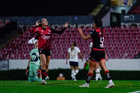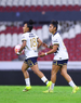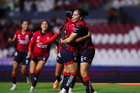 Guadalajara, Jalisco, 5 de febrero de 2026. Karen Flores y Sanjuana Muñoz en festejo de gol, durante el partido correspondiente a la jornada 7 del torneo Clausura 2026 de la Liga BBVA MX Femenil, entre las Rojinegras del Atlas y las Pumas de la UNAM, realizado en el estadio Jalisco. Foto: Imago7/ Alejandro Lias