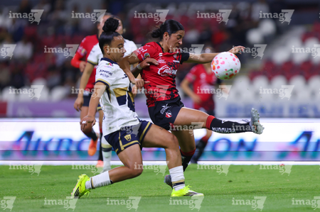 Guadalajara, Jalisco, 5 de febrero de 2026. Paola Chavero y Noemí Villalobos, durante el partido correspondiente a la jornada 7 del torneo Clausura 2026 de la Liga BBVA MX Femenil, entre las Rojinegras del Atlas y las Pumas de la UNAM, realizado en el estadio Jalisco. Foto: Imago7/ Juan Carlos Cubeyro.