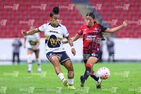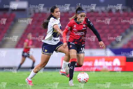 Guadalajara, Jalisco, 5 de febrero de 2026. Nayely Bolaños y Dirce Delgado, durante el partido correspondiente a la jornada 7 del torneo Clausura 2026 de la Liga BBVA MX Femenil, entre las Rojinegras del Atlas y las Pumas de la UNAM, realizado en el estadio Jalisco. Foto: Imago7/ Alejandro Lias