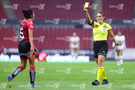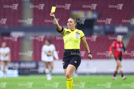 Guadalajara, Jalisco, 5 de febrero de 2026. Francia González, árbitro central, muestra tarjeta amarilla de amonestación, durante el partido correspondiente a la jornada 7 del torneo Clausura 2026 de la Liga BBVA MX Femenil, entre las Rojinegras del Atlas y las Pumas de la UNAM, realizado en el estadio Jalisco. Foto: Imago7/ Juan Carlos Cubeyro.
