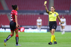 Guadalajara, Jalisco, 5 de febrero de 2026. Francia González, árbitro central, muestra tarjeta amarilla de amonestación a María Sainz, durante el partido correspondiente a la jornada 7 del torneo Clausura 2026 de la Liga BBVA MX Femenil, entre las Rojinegras del Atlas y las Pumas de la UNAM, realizado en el estadio Jalisco. Foto: Imago7/ Juan Carlos Cubeyro.