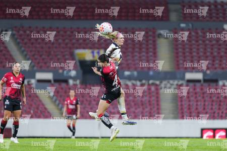 Guadalajara, Jalisco, 5 de febrero de 2026. Iliana Jasso y Angelina Hix, durante el partido correspondiente a la jornada 7 del torneo Clausura 2026 de la Liga BBVA MX Femenil, entre las Rojinegras del Atlas y las Pumas de la UNAM, realizado en el estadio Jalisco. Foto: Imago7/ Hugo Ramírez