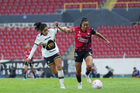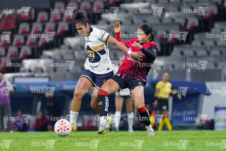 Guadalajara, Jalisco, 5 de febrero de 2026. Nayely Bolaños y Karen Ramírez, durante el partido correspondiente a la jornada 7 del torneo Clausura 2026 de la Liga BBVA MX Femenil, entre las Rojinegras del Atlas y las Pumas de la UNAM, realizado en el estadio Jalisco. Foto: Imago7/ Juan Carlos Cubeyro.