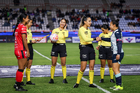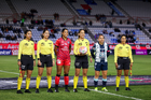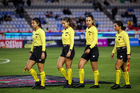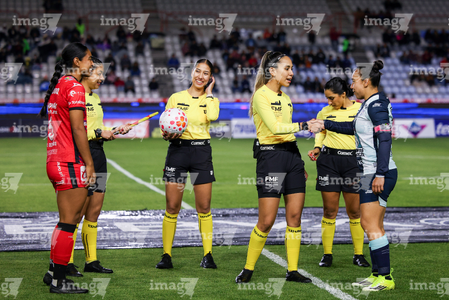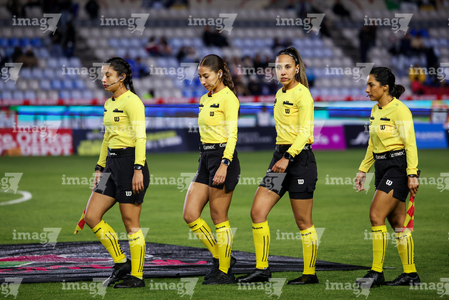 Pachuca, Hidalgo, 6 de febrero de 2026. Cuarteta arbitral, durante el partido correspondiente a la jornada 7 del torneo Clausura 2026 de la Liga BBVA MX Femenil, entre las Tuzas del Pachuca y las Cañoneras del Mazatlán FC, realizado en el estadio Hidalgo. Foto: Imago7/ Elizabeth Hernández