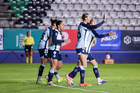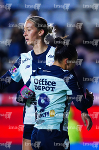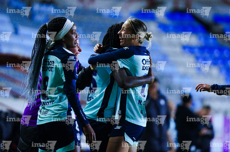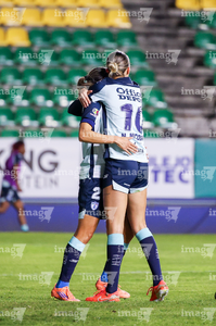 Pachuca, Hidalgo, 6 de febrero de 2026. Nina Nicosia y Charlyn Corral en festejo de gol, durante el partido correspondiente a la jornada 7 del torneo Clausura 2026 de la Liga BBVA MX Femenil, entre las Tuzas del Pachuca y las Cañoneras del Mazatlán FC, realizado en el estadio Hidalgo. Foto: Imago7/ Jacqueline Pedraza