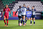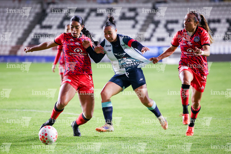 Pachuca, Hidalgo, 6 de febrero de 2026. Vasthy Delgado, Charlyn Corral y Vanessa Sánchez, durante el partido correspondiente a la jornada 7 del torneo Clausura 2026 de la Liga BBVA MX Femenil, entre las Tuzas del Pachuca y las Cañoneras del Mazatlán FC, realizado en el estadio Hidalgo. Foto: Imago7/ Elizabeth Hernández