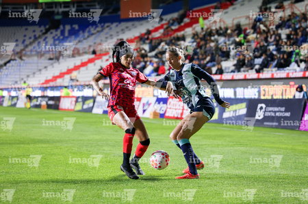 Pachuca, Hidalgo, 6 de febrero de 2026. Vasthy Delgado y Charlyn Corral, durante el partido correspondiente a la jornada 7 del torneo Clausura 2026 de la Liga BBVA MX Femenil, entre las Tuzas del Pachuca y las Cañoneras del Mazatlán FC, realizado en el estadio Hidalgo. Foto: Imago7/ Elizabeth Hernández