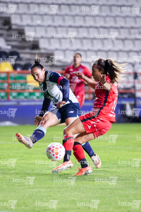 Pachuca, Hidalgo, 6 de febrero de 2026. Ambar González y Nina Nicosia, durante el partido correspondiente a la jornada 7 del torneo Clausura 2026 de la Liga BBVA MX Femenil, entre las Tuzas del Pachuca y las Cañoneras del Mazatlán FC, realizado en el estadio Hidalgo. Foto: Imago7/ Elizabeth Hernández