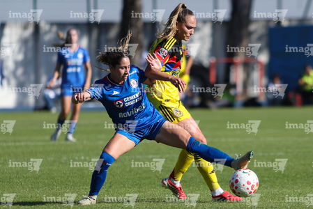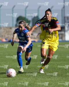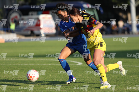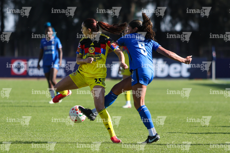 Cuernavaca, Morelos, 9 de febrero de 2026. Ivonne Gutiérrez y Montserrat Saldivar durante el partido correspondiente a la jornada 8 del torneo Clausura 2026 de la Liga BBVA MX Femenil, entre la Máquina Celeste del Cruz Azul y las Águilas del América, realizado en el estadio Centenario. Foto: Imago7/ Daniel Sydney
