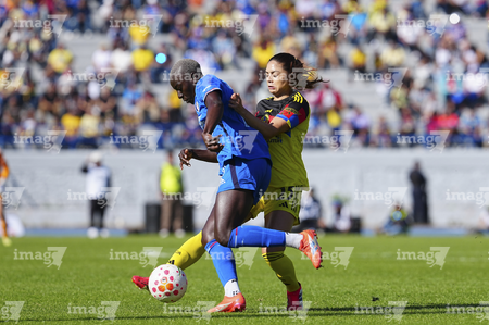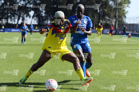 Cuernavaca, Morelos, 9 de febrero de 2026. Michaela Abam y Jana Gutiérrez, durante el partido correspondiente a la jornada 8 del torneo Clausura 2026 de la Liga BBVA MX Femenil, entre la Máquina Celeste del Cruz Azul y las Águilas del América, realizado en el estadio Centenario. Foto: Imago7/ Manlio Contreras