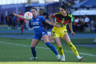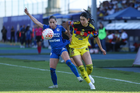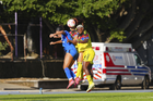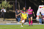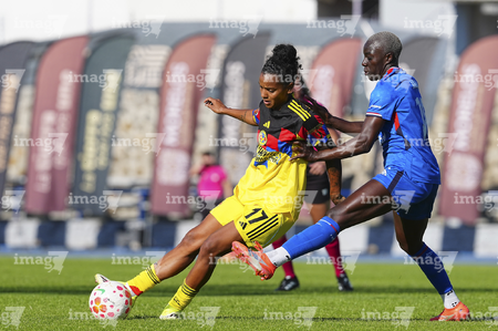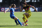 Cuernavaca, Morelos, 9 de febrero de 2026. Leigh-anne Robe y Montserrat Saldivar, durante el partido correspondiente a la jornada 8 del torneo Clausura 2026 de la Liga BBVA MX Femenil, entre la Máquina Celeste del Cruz Azul y las Águilas del América, realizado en el estadio Centenario. Foto: Imago7/ Daniel Sydney