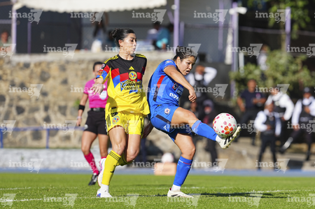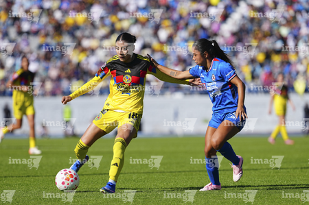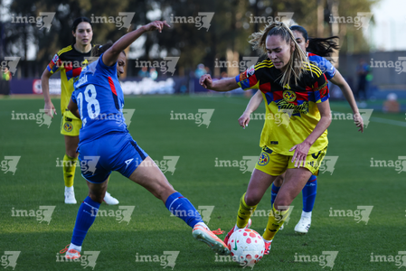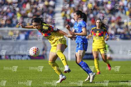 Cuernavaca, Morelos, 9 de febrero de 2026. Jana Gutiérrez y América Frías, durante el partido correspondiente a la jornada 8 del torneo Clausura 2026 de la Liga BBVA MX Femenil, entre la Máquina Celeste del Cruz Azul y las Águilas del América, realizado en el estadio Centenario. Foto: Imago7/ Daniel Sydney