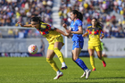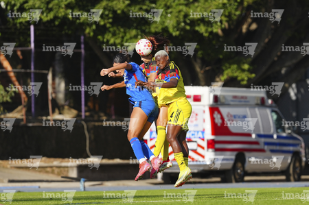 Cuernavaca, Morelos, 9 de febrero de 2026. Geyse Da Silva y Michaela Abam, durante el partido correspondiente a la jornada 8 del torneo Clausura 2026 de la Liga BBVA MX Femenil, entre la Máquina Celeste del Cruz Azul y las Águilas del América, realizado en el estadio Centenario. Foto: Imago7/ Manlio Contreras