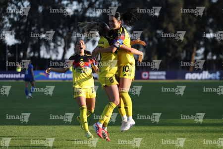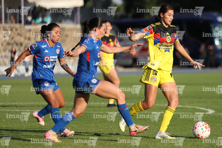 Cuernavaca, Morelos, 9 de febrero de 2026. Aerial Chavarin, Jana Gutiérrez y Chidinma Okeke, durante el partido correspondiente a la jornada 8 del torneo Clausura 2026 de la Liga BBVA MX Femenil, entre la Máquina Celeste del Cruz Azul y las Águilas del América, realizado en el estadio Centenario. Foto: Imago7/ Manlio Contreras